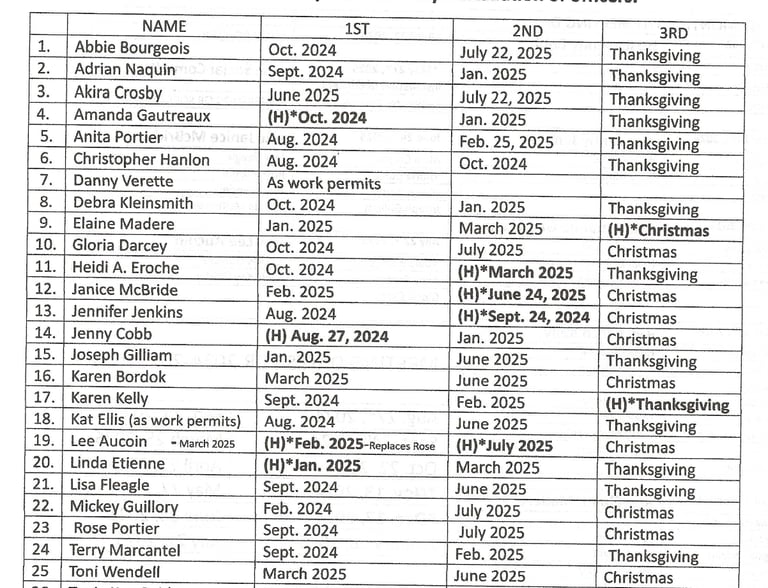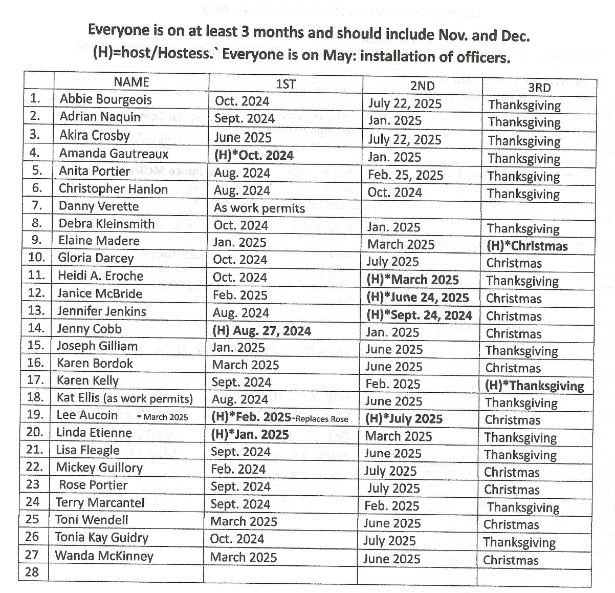 Hosts and Hostesses must call to meet with their respective committee to decide the menu and possible theme: New Years, Mardi Gras, etc.